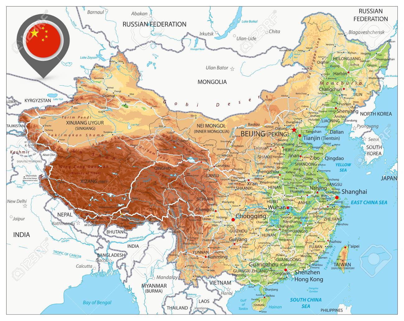 China Physical Map. High Detailed China Relief Map With Labeling